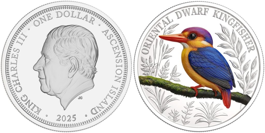 ILE DE L’ASCENSION 1 Dollar 2025 – Martin-pêcheur oriental – 31,1 g Argent 999 Proof – 1000 exemplaires – diamètre 38,6 mm – prix observé 133 euros.