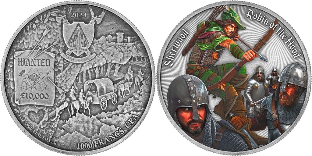 CAMEROON 1000 Francs CFA 2024 – Robin Wood – 1 oz 0.999 silver antique finish – mintage 250 pcs only – diameter 38.61 mm – unknown price.