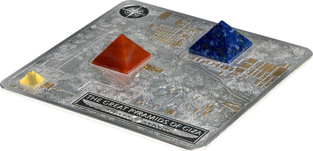 FIJI 5 Dollars 2025 – Great Pyramids of Giza – 3 oz 0.999 silver Proof (with carnelian and lapis lazuli stones and Lybian desert glass) – mintage 1,000 – diameter 80 mm – observed price $808.50.
