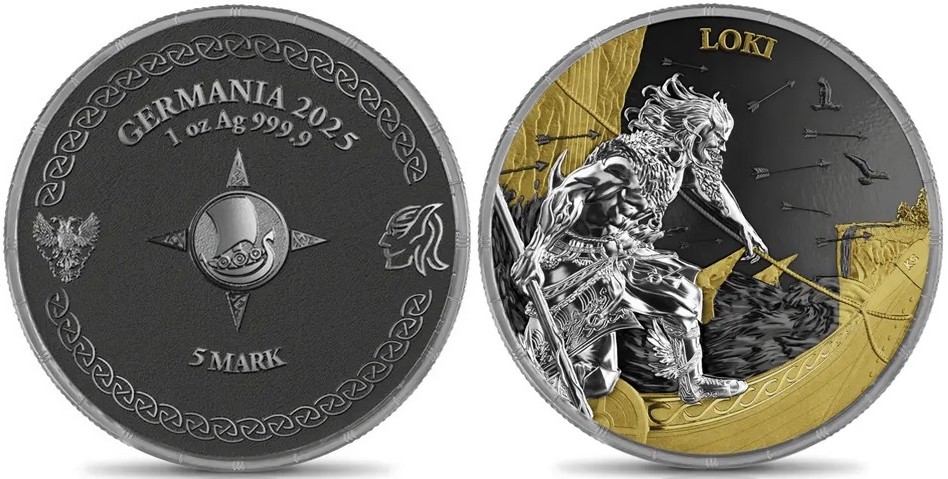 GERMANIA 5 Mark 2025 – Ragnarok : Loki – 1 oz 0.999 silver BU – mintage 5,000 – diameter 38.61 mm – unknown price.