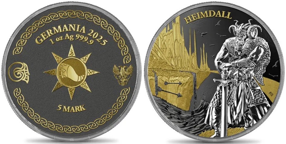 GERMANIA 5 Mark 2025 – Ragnarok : Heimdall – 1 oz 0.999 silver BU – mintage 5,000 – diameter 38.61 mm – unknown price.
