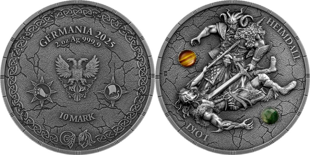GERMANIA 10 Mark 2025 – Ragnarok : Loki & Heimdall – 2 oz 0.999 silver antique finish (with agathe and tiger’s eye included) – mintage 500 pcs only – diameter 45 mm – unknown price.