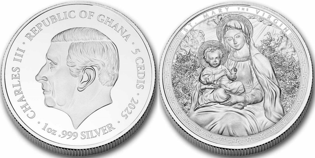 GHANA  5 Cedis 2025 – St. Mary the Virgin – 1 oz 0.999 silver Proof – mintage 999 pcs – diameter 39.9 mm – unknown price.