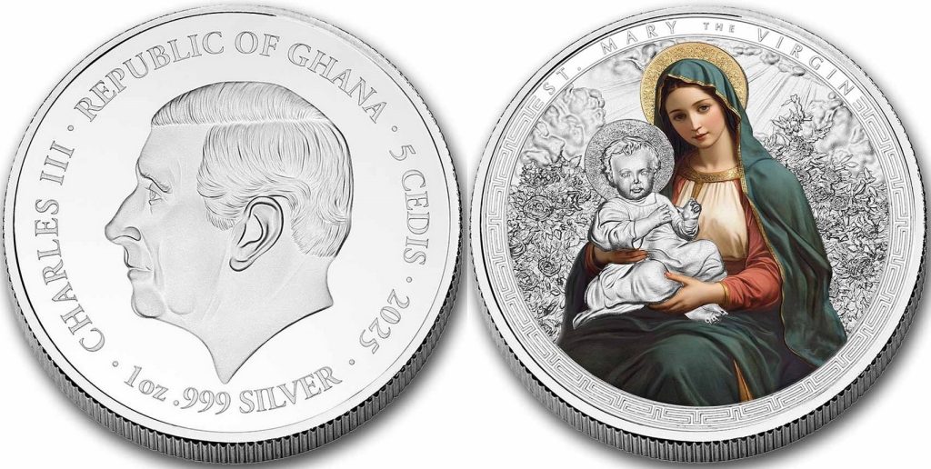GHANA  5 Cedis 2025 – St. Mary the Virgin (color) – 1 oz 0.999 silver Proof – mintage 999 pcs – diameter 39.9 mm – unknown price.