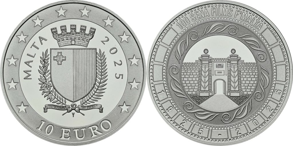 MALTE 10 Euro 2025 – 100 ans d’histoire du cinéma à Malte – 31,1 g Argent 999 Proof – 501 exemplaires seulement – diamètre 38,61 mm – prix observé 89,90 euros.