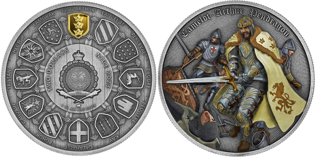 NIUE 2 Dollars 2023 – Camelot : Arthur Pendragon – 1 oz 0.999 silver antique finish – mintage 250 pcs only – diameter 38.61 mm – unknown price.