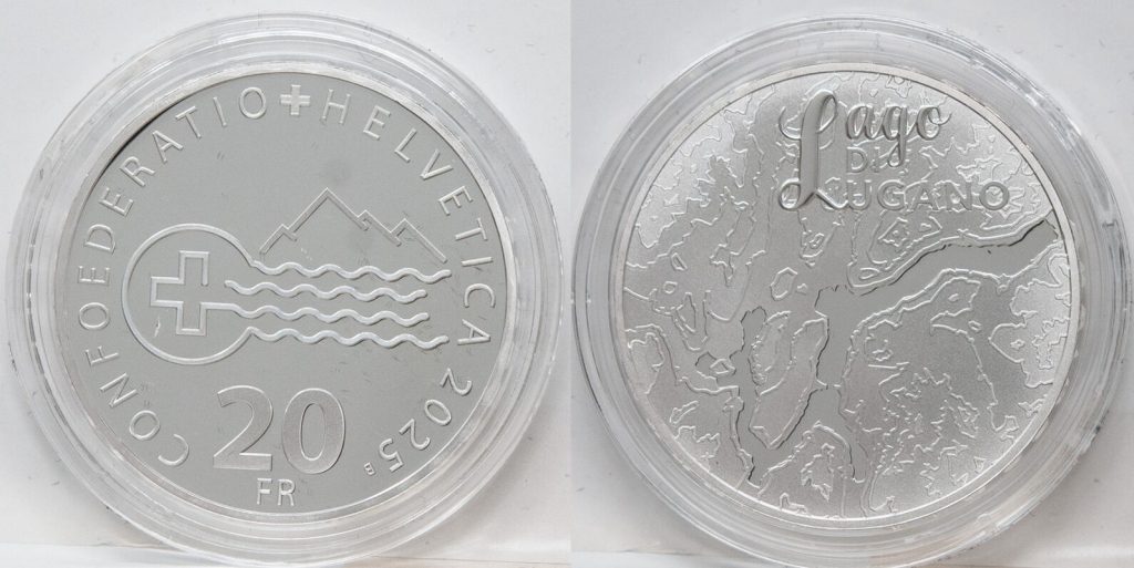 SWITZERLAND 20 Francs 2025 – Lugano Lake – 20 g 0.999 silver Proof – mintage 3,500 – diameter 33 mm – observed price $98.20. BU finish exist.