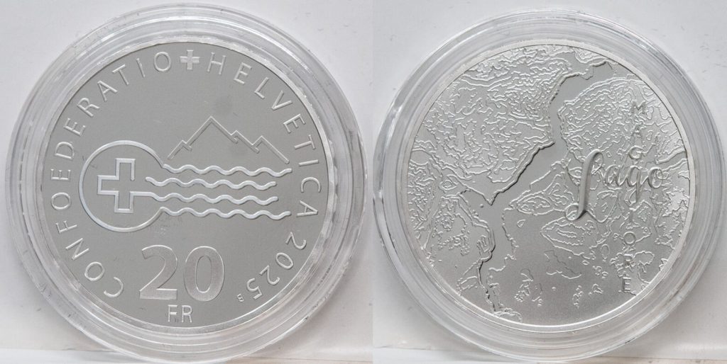 SWITZERLAND 20 Francs 2025 – Maggiore Lake – 20 g 0.999 silver Proof – mintage 3,500 – diameter 33 mm – observed price $98.20. BU finish exist.