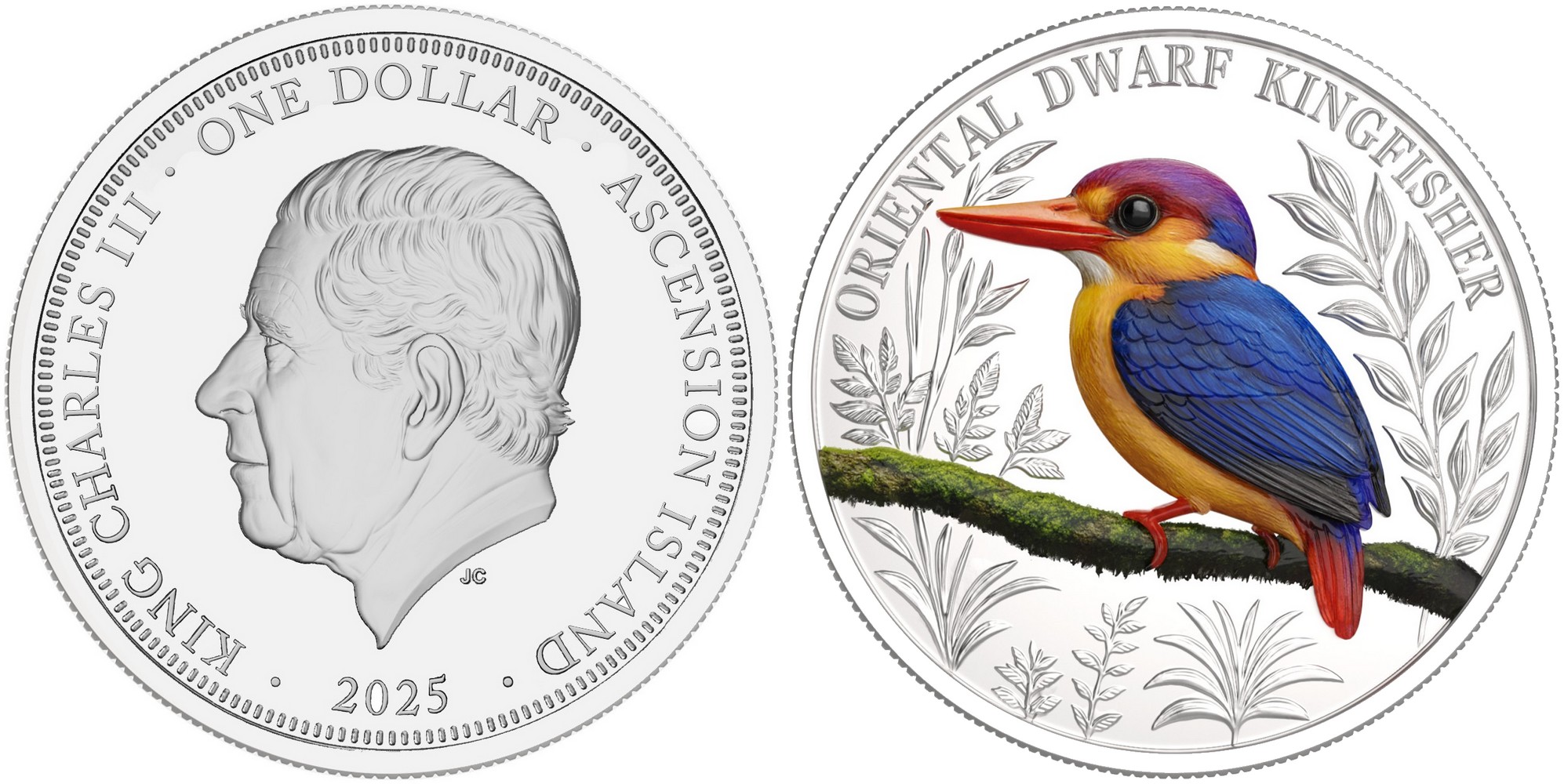 ASCENSION ISL 1 Dollar 2025 – Oriental Kingfisher – 1 oz 0.999 silver Proof – mintage 1,000 – diameter 38.6 mm – observed price $155.