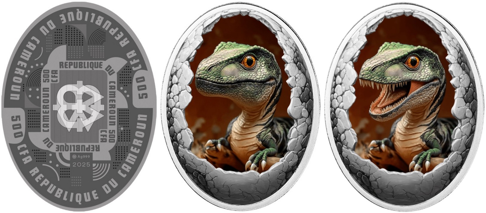 CAMEROON 500 Francs CFA 2025 – Dinosaurs : Tyrannosaurus Rex – 16.81 g 0.999 silver Proof (lenticular printing 3D effect) – mintage 500 pcs only – size 29.2 x 39 mm – unknown price.