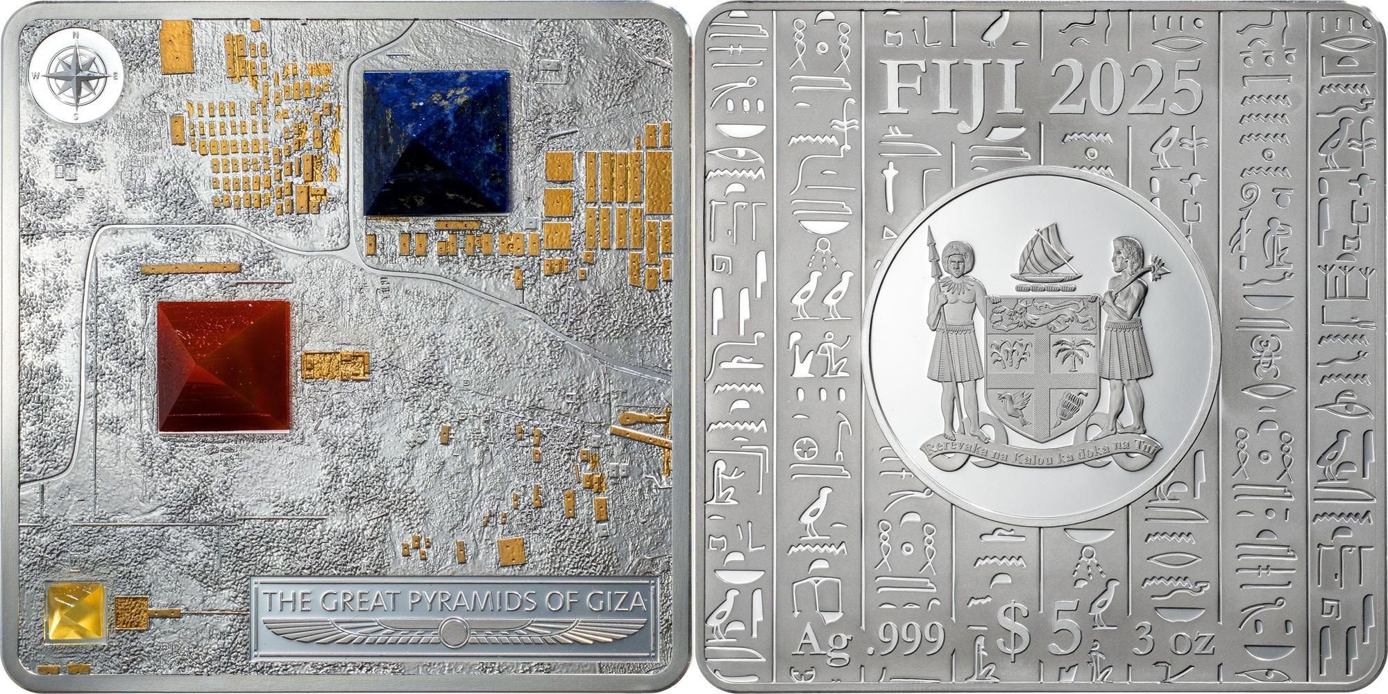 FIJI 5 Dollars 2025 – Great Pyramids of Giza – 3 oz 0.999 silver Proof (with carnelian and lapis lazuli stones and Lybian desert glass) – mintage 1,000 – diameter 80 mm – observed price $808.50.