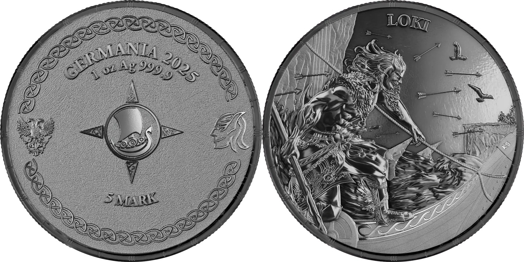 GERMANIA 5 Mark 2025 – Ragnarok : Loki – 1 oz 0.999 silver BU – mintage 5,000 – diameter 38.61 mm – unknown price.