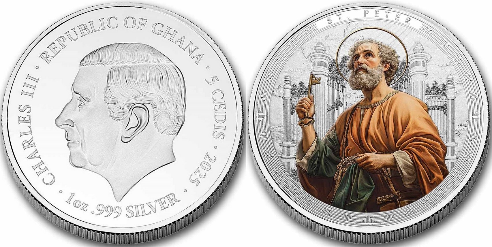 GHANA  5 Cedis 2025 – St. Peter (color) – 1 oz 0.999 silver Proof – mintage 999 pcs – diameter 39.9 mm – unknown price.
