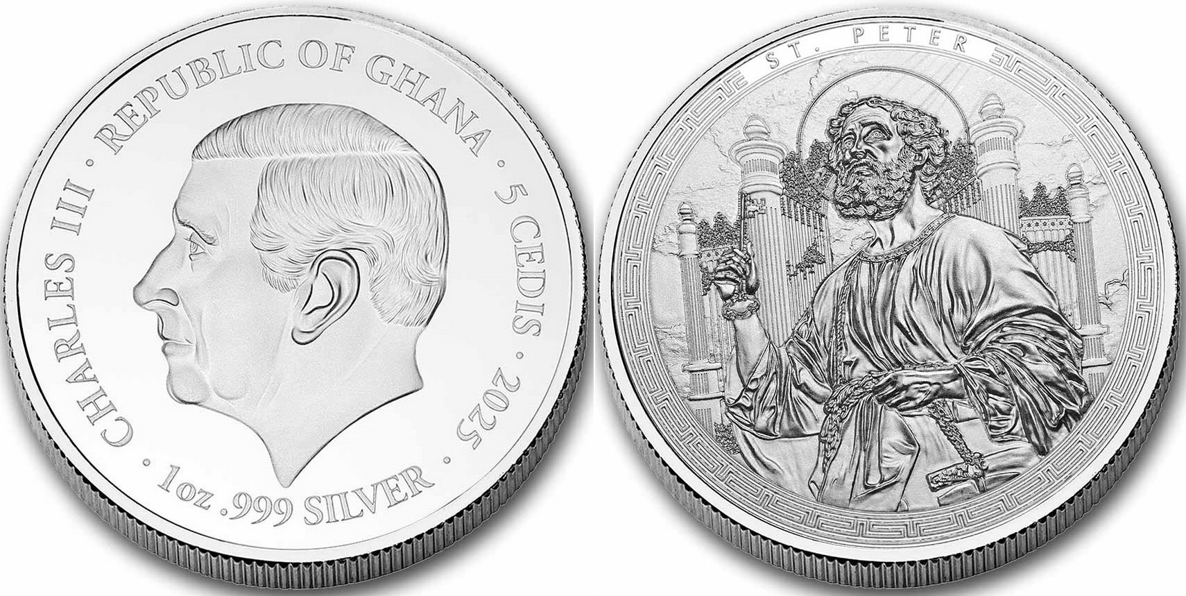 GHANA  5 Cedis 2025 – St. Peter – 1 oz 0.999 silver Proof – mintage 999 pcs – diameter 39.9 mm – unknown price.