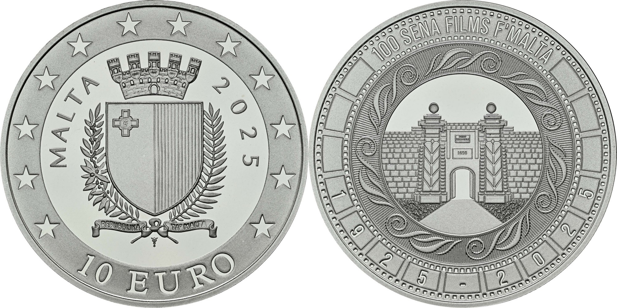 MALTE 10 Euro 2025 – 100 ans d’histoire du cinéma à Malte – 31,1 g Argent 999 Proof – 501 exemplaires seulement – diamètre 38,61 mm – prix observé 89,90 euros.