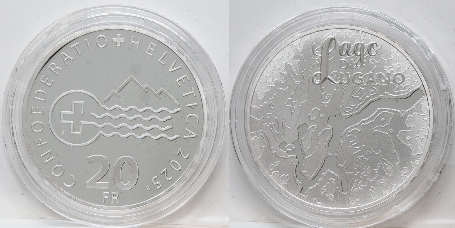 SWITZERLAND 20 Francs 2025 – Lugano Lake – 20 g 0.999 silver Proof – mintage 3,500 – diameter 33 mm – observed price $98.20. BU finish exist.