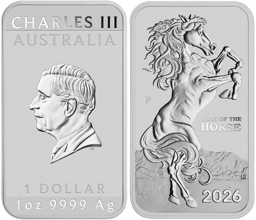 AUSTRALIA 1 Dollar 2026 – Year of the Horse – 1 oz 0.999 silver bullion – mintage 300,000 – size 27.6 x 47.6 mm – unknown price.
