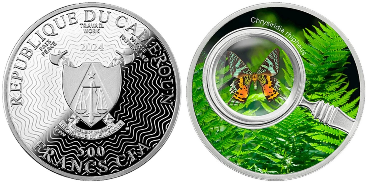 CAMEROON 500 Francs CFA 2024 – Butterfly Chrysiridia Rhipheus – 17.5 g 0.999 silver Proof – mintage 555 pcs – diameter 50 mm – observed price $116.50.