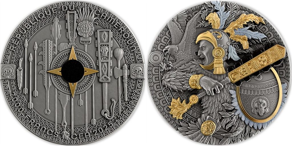CAMEROON 2000 Francs CFA 2025 – Eagle Warrior – 2 oz 0.999 silver antique finish – mintage 500 pcs only – diameter 45 mm – unknown price.