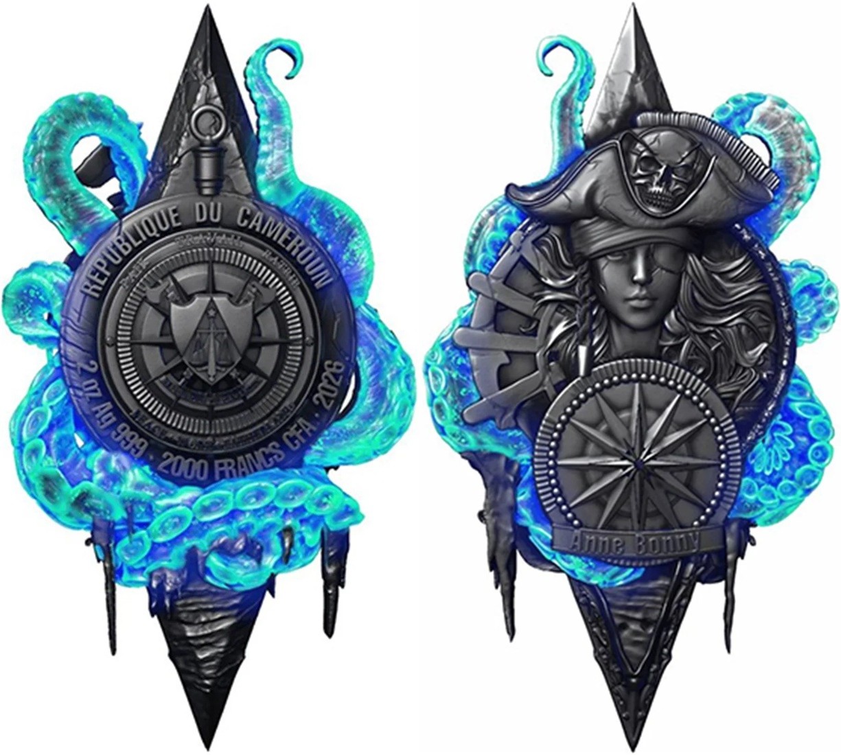 CAMEROON 2000 Francs CFA 2026 – Anne Bonny – 2 oz 0.999 silver antique finish (high relief with UV painting) – mintage 199 pcs only – size 36 x 65 mm – unknown price.