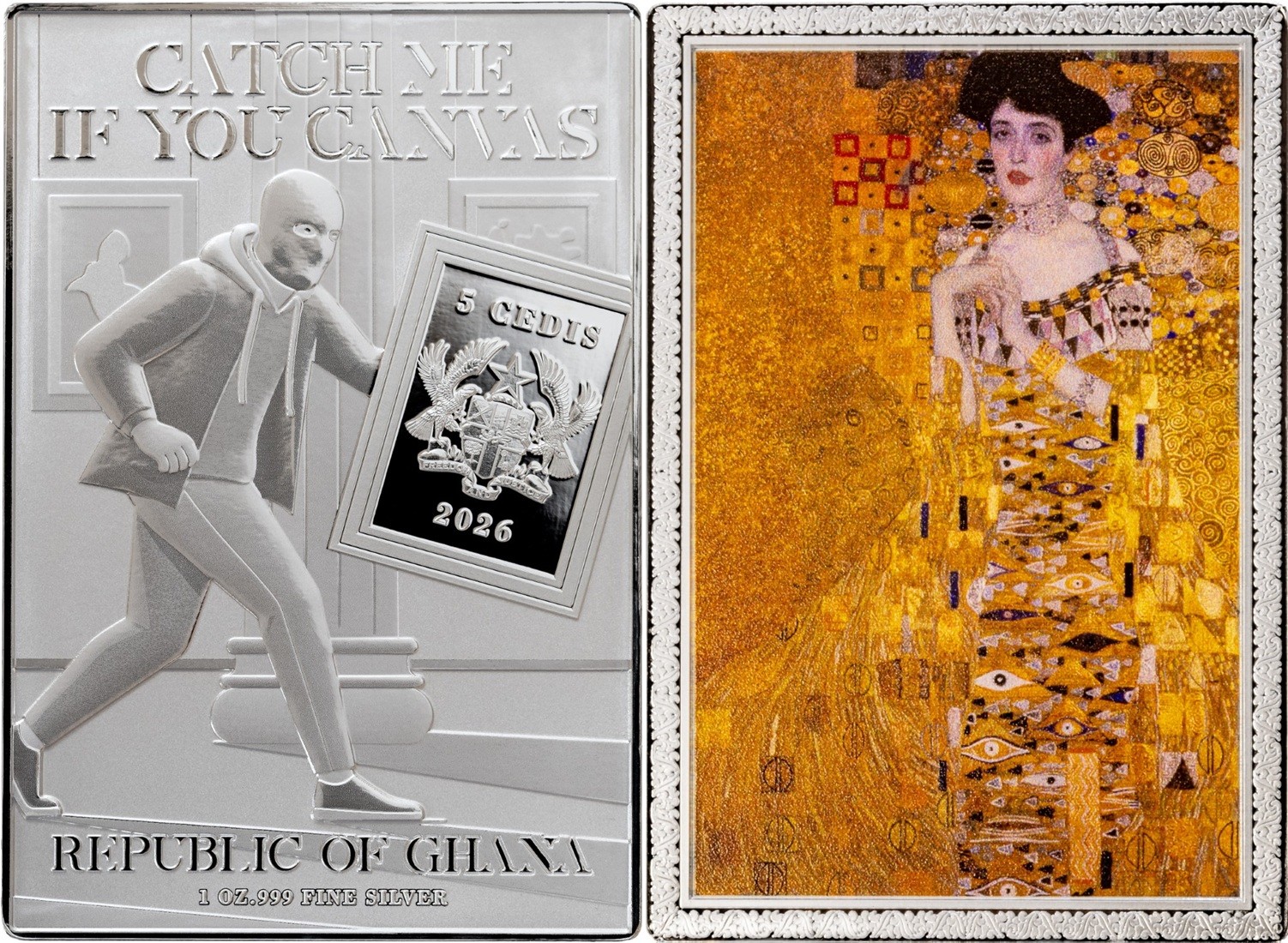 GHANA 5 Cedis 2026 – Portrait of Adele Bloch-Bauer by Gustav Klimt – 1 oz 0.999 silver Proof – mintage 99 pcs only – size 36 x 53 mm – unknown price.