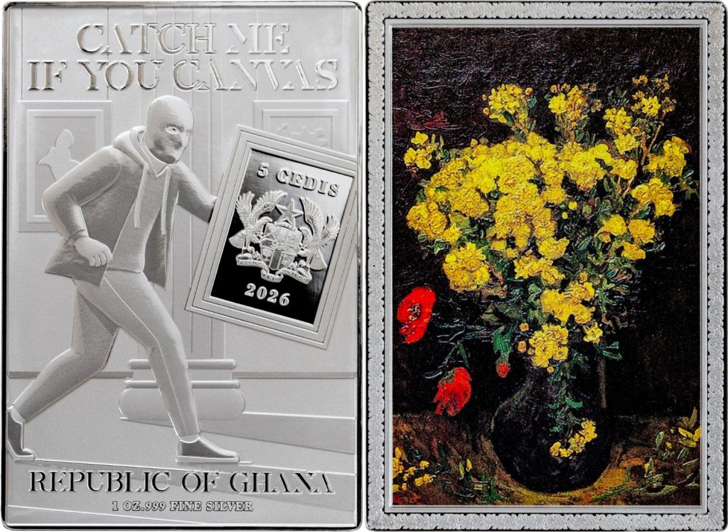GHANA 5 Cedis 2026 – Poppy Flowers by Van Gogh – 1 oz 0.999 silver Proof – mintage 99 pcs only – size 36 x 53 mm – unknown price.