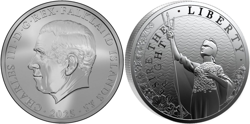 ILES FALKLAND 5 Pounds 2025 – Liberté – 31,1 g Argent 999 Proof – 500 exemplaires seulement – diamètre 38,6 mm – prix ignoré. Existe en version de 5 onces.