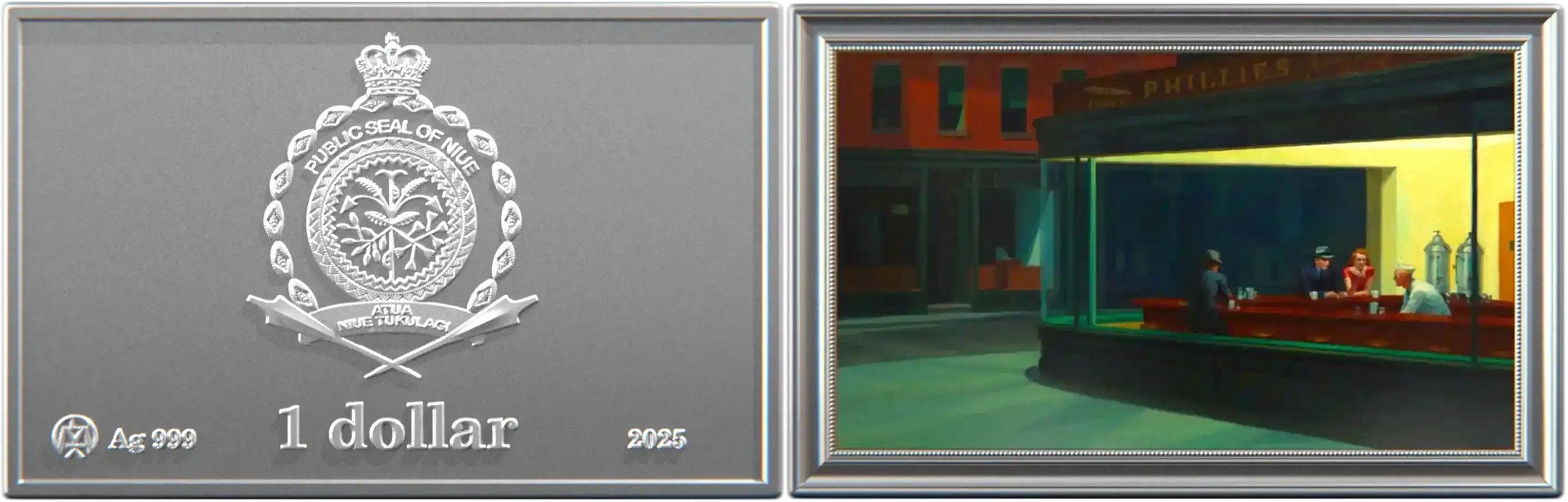 NIUE 1 Dollar 2025 – Nighthawks by Edward Hopper – 1 oz 0.999 silver Proof-like – mintage 300 pcs only – size 47 x 30 mm – unknown price.