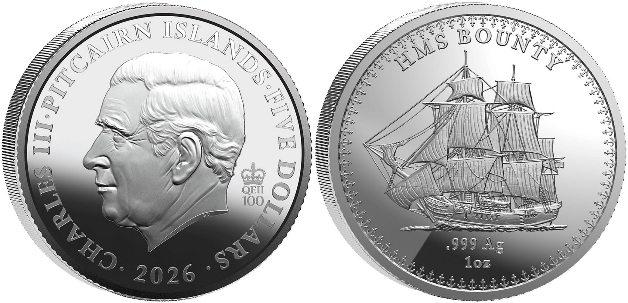 PITCAIRN ISL 5 Dollars 2026 – HMS Bounty – 1 oz 0.999 silver Proof – mintage 500 pcs only – diameter 38.6 mm – unknown price. 5 ounces version exist.