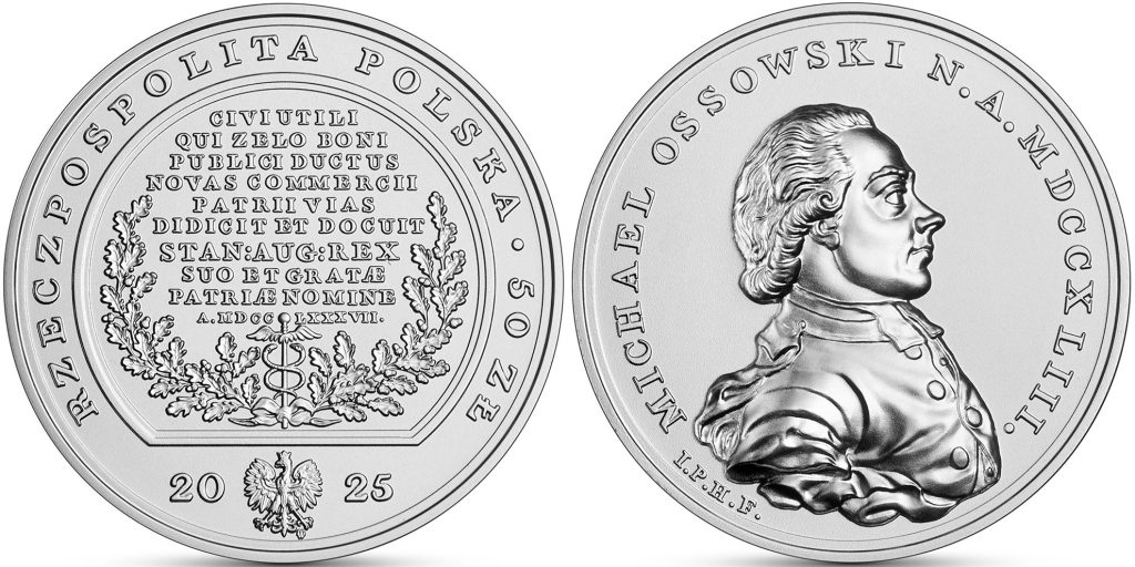 POLAND 50 Zloty 2025 – Michael Ossowski – 2 oz 0.999 silver BU (high relief) – mintage 5,000 – diameter 45 mm – unknown price.