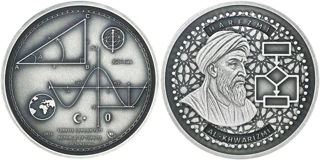 TURQUIE 20 Lira 2025 – Al-Khwarizmi – 31,1 g Argent 925 oxydée – 3000 exemplaires – diamètre 38,61 mm – prix ignoré.