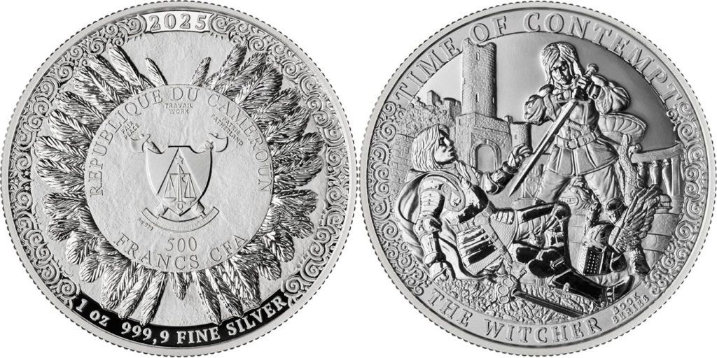 CAMEROON 500 Francs CFA 2025 – The Witcher : Time of Contempt – 1 oz 0.999 silver BU – mintage 1,000 – diameter 38.61 mm – unknown price. 2 ounces version exist.