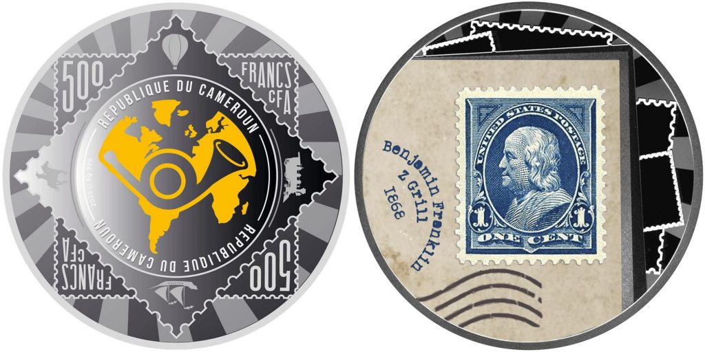 CAMEROON 500 Francs CFA 2025 – Benjamin Franklin « Z-Grill » Stamp – 17.5 g 0.999 silver Proof – mintage 558 pcs – diameter 50 mm – unknown price.