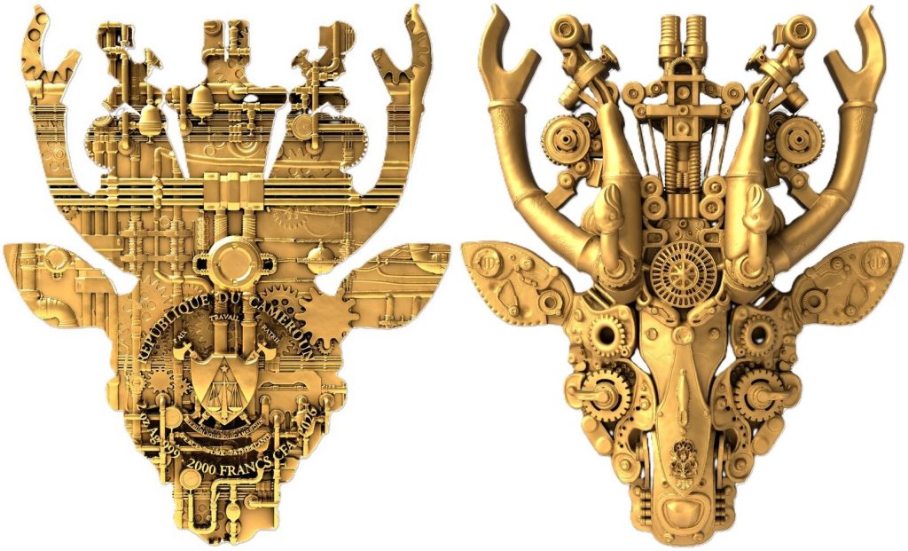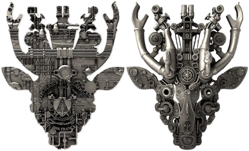 CAMEROUN 2000 Francs CFA 2026 – Steampunk allégeance – 62,2 g Argent 999 finition antique (haut relief avec néon rouge) – 99 exemplaires seulement – taille 55 x 65 mm – prix observé 289,95 euros.