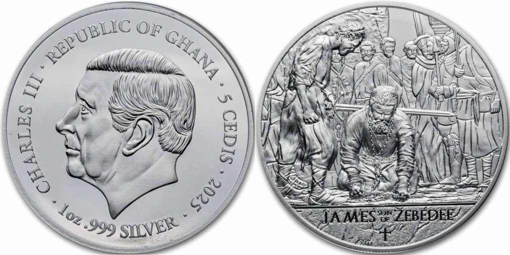 GHANA 5 Cedis 2025 – Apostle James – 31.1 g 0.999 silver Proof – mintage 999 pcs – diameter 39.9 mm – unknown price.