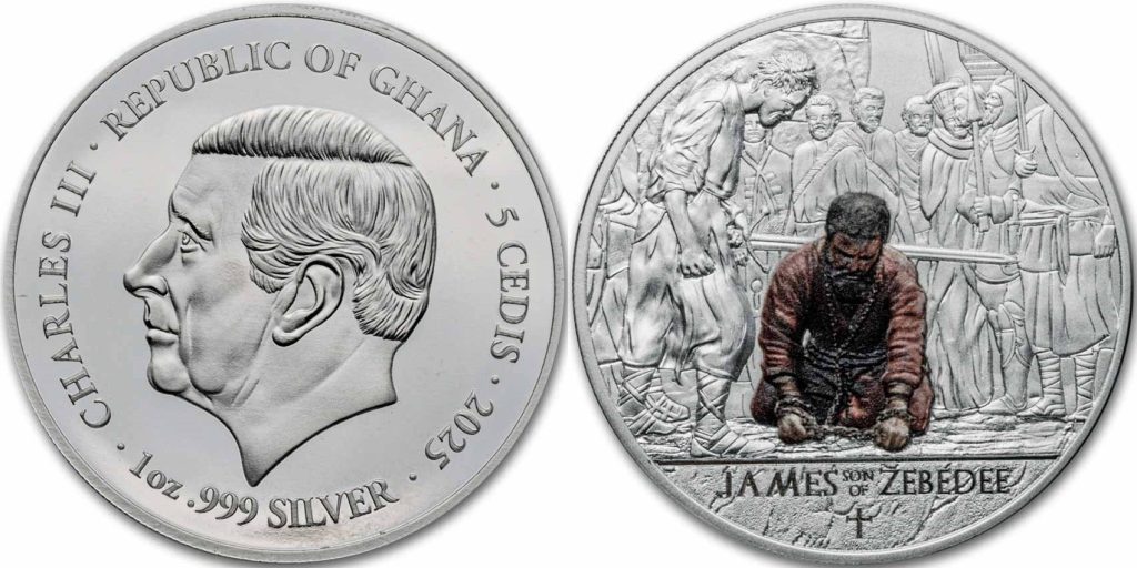GHANA 5 Cedis 2025 – Apostle James (color) – 31.1 g 0.999 silver Proof – mintage 999 pcs – diameter 39.9 mm – unknown price.