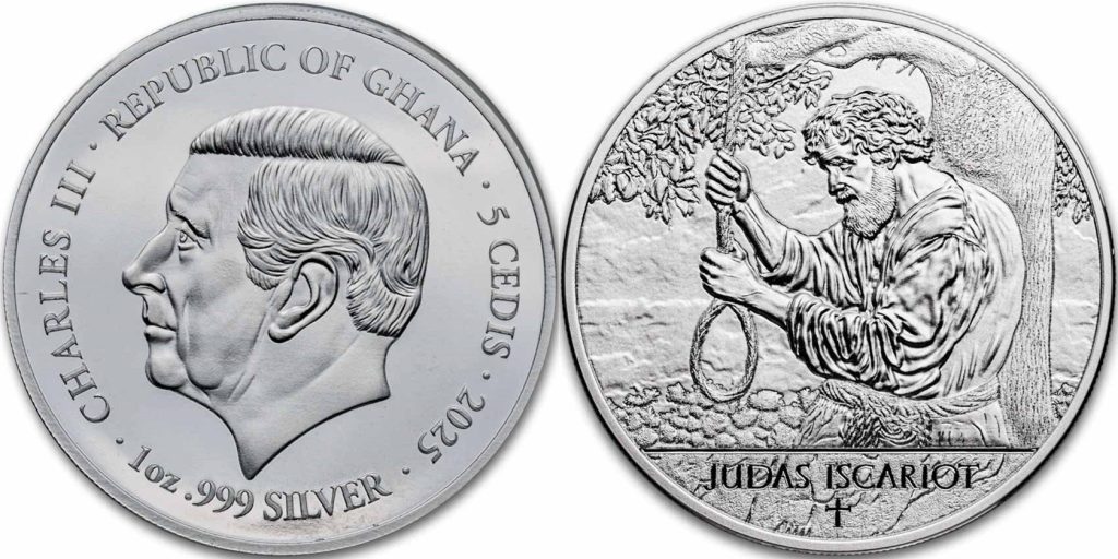 GHANA 5 Cedis 2025 – Judas Escariot – 31.1 g 0.999 silver Proof – mintage 999 pcs – diameter 39.9 mm – unknown price.