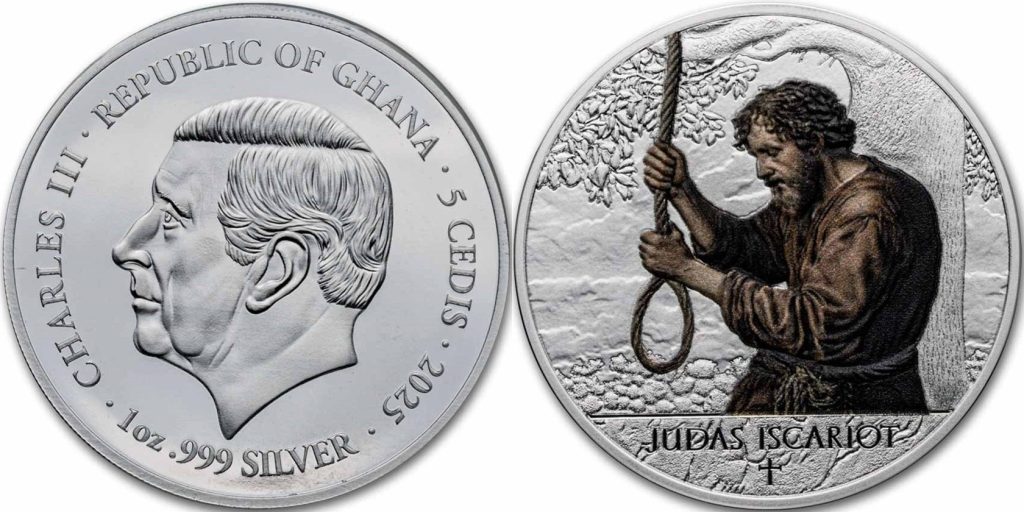 GHANA 5 Cedis 2025 – Judas Escariot (color) – 31.1 g 0.999 silver Proof – mintage 999 pcs – diameter 39.9 mm – unknown price.