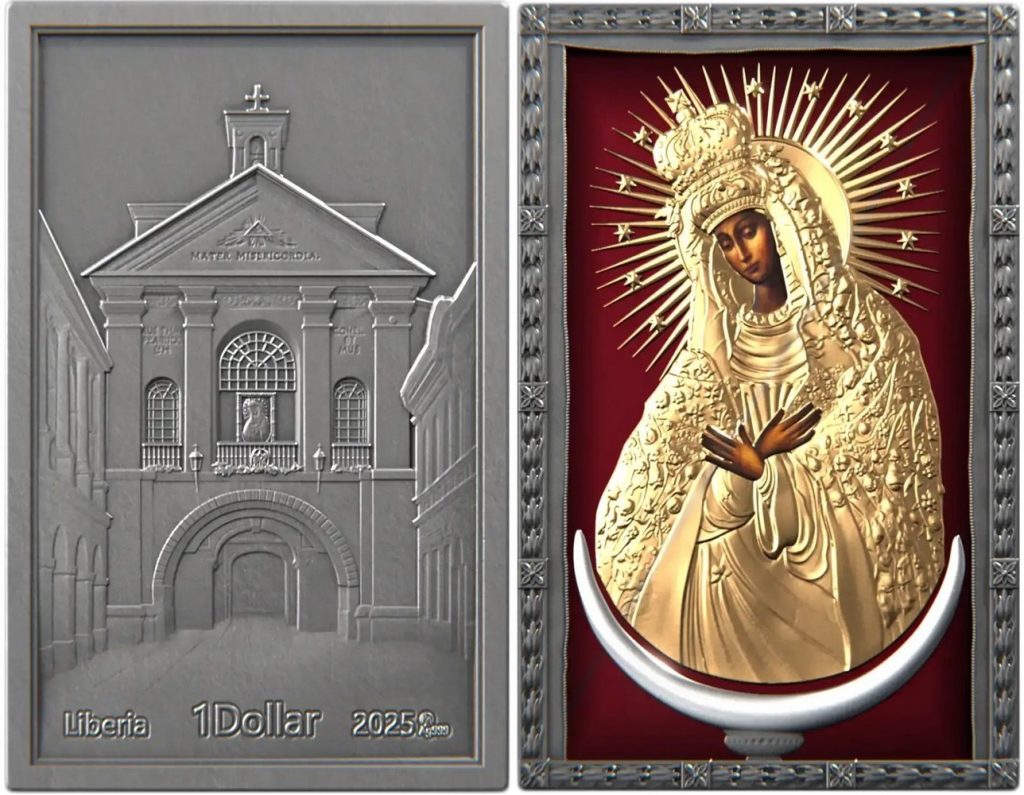 LIBERIA 1 Dollar 2025 – Our Lady of the Gate of Dawn – 1 oz 0.999 silver antique finish – mintage 300 pcs only – size 30 x 47 mm – unknown price.