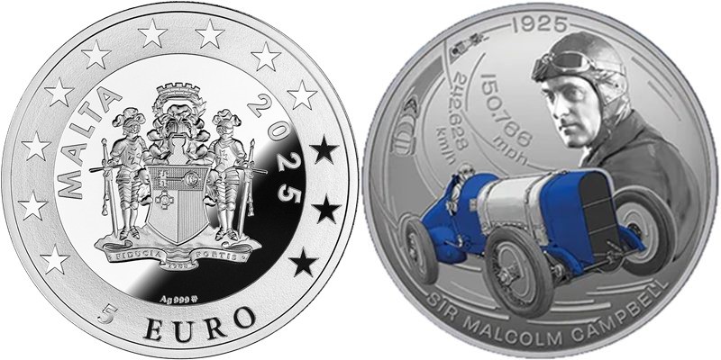 MALTA 5 Euro 2025 – Sir Malcolm Campbell – 1 oz 0.999 silver Proof – mintage 700 pcs – diameter 38.61 mm – unknown price.