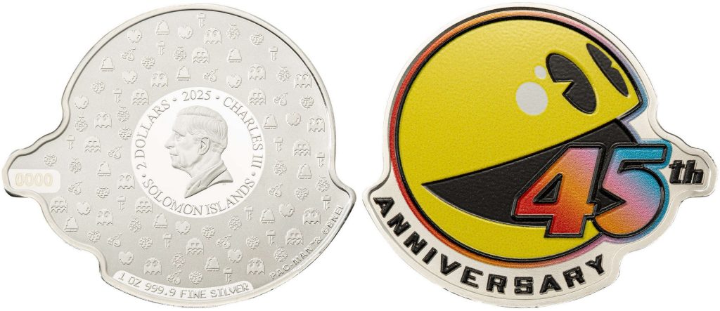 SOLOMON ISL 2 Dollars 2025 – Pac-Man 45th Anniversary – 1 oz 0.999 silver Proof-like – mintage 2,000 – size 44 x 38.84 mm – unknown price.