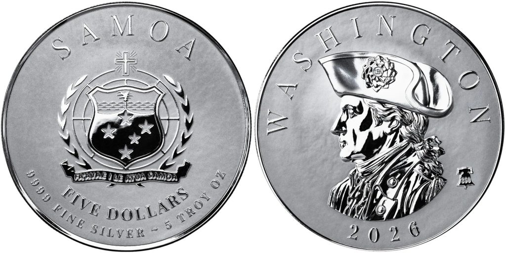 SAMOA 5 Dollars 2026 – George Washington – 5 oz 0.999 silver BU – mintage 4,999 – diameter 65 mm – unknown price.