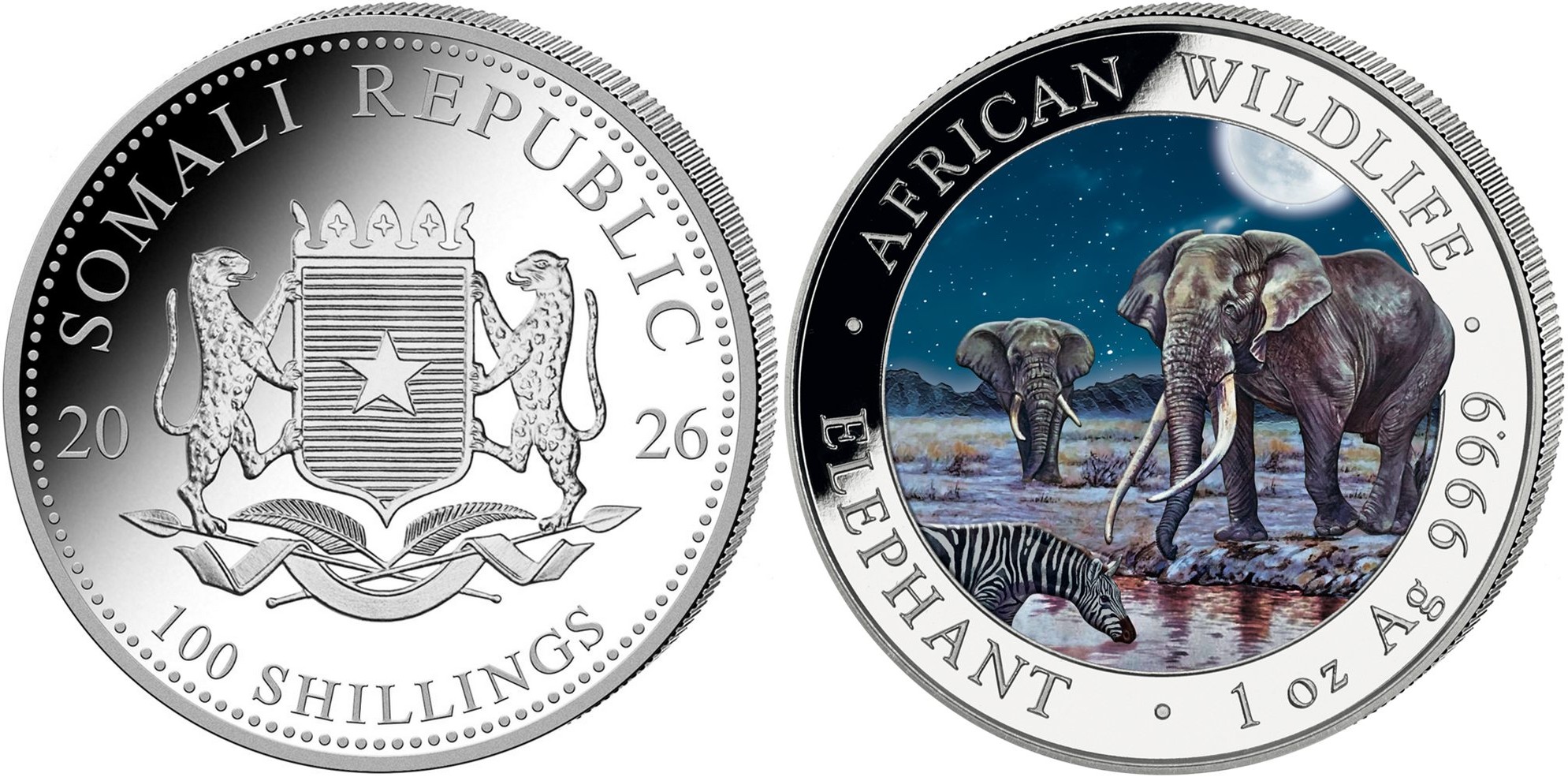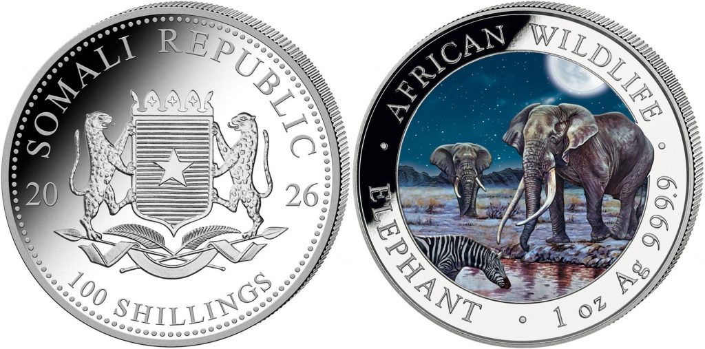 SOMALIA 100 Shillings 2026 – 1 oz 0.999 silver BU – mintage 500 pc sonly – diameter 38.6 mm – unknown price.