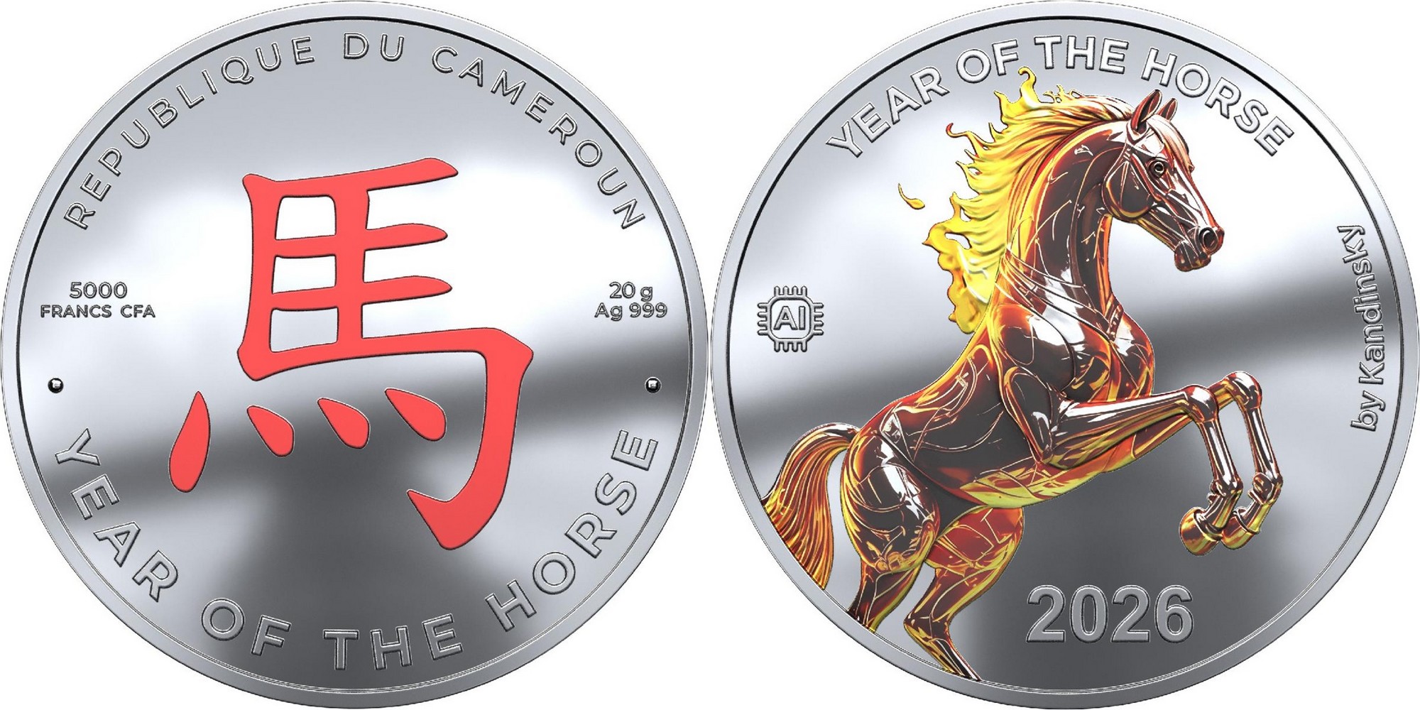 CAMEROON 5000 Francs CFA 2026 – Year of the Horse AI – 20 g 0.999 silver Proof – mintage 8,000 – diameter 40 mm – unknown price.