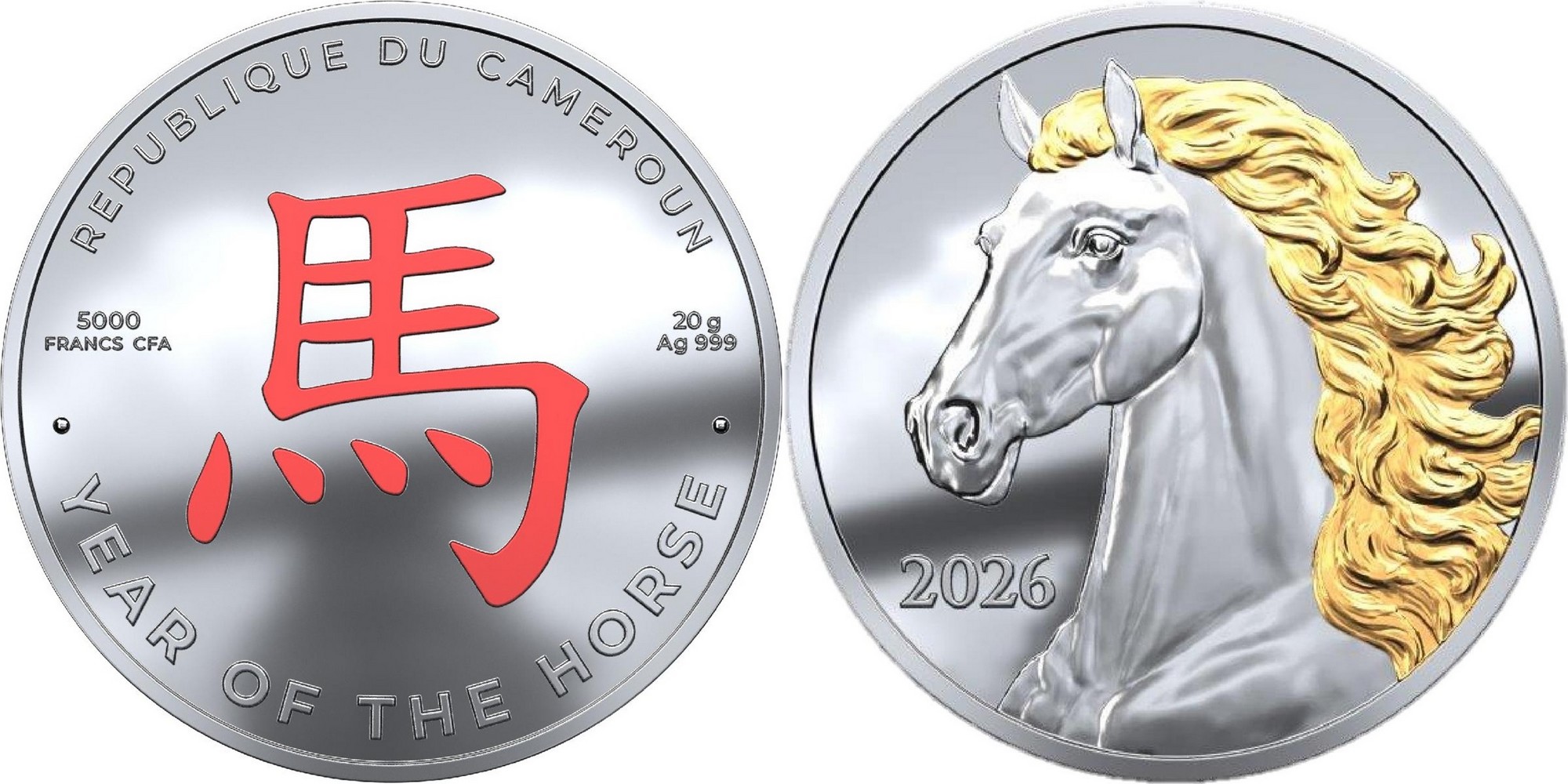CAMEROON 5000 Francs CFA 2026 – Year of the Horse – 20 g 0.999 silver Proof – mintage 8,000 – diameter 40 mm – unknown price.