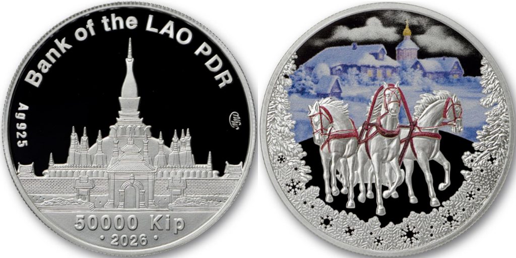 LAOS 50000 Kip 2026 – Troika – 17 g 0.925 silver Proof – mintage 1,000 – diameter 33 mm – unknown price.
