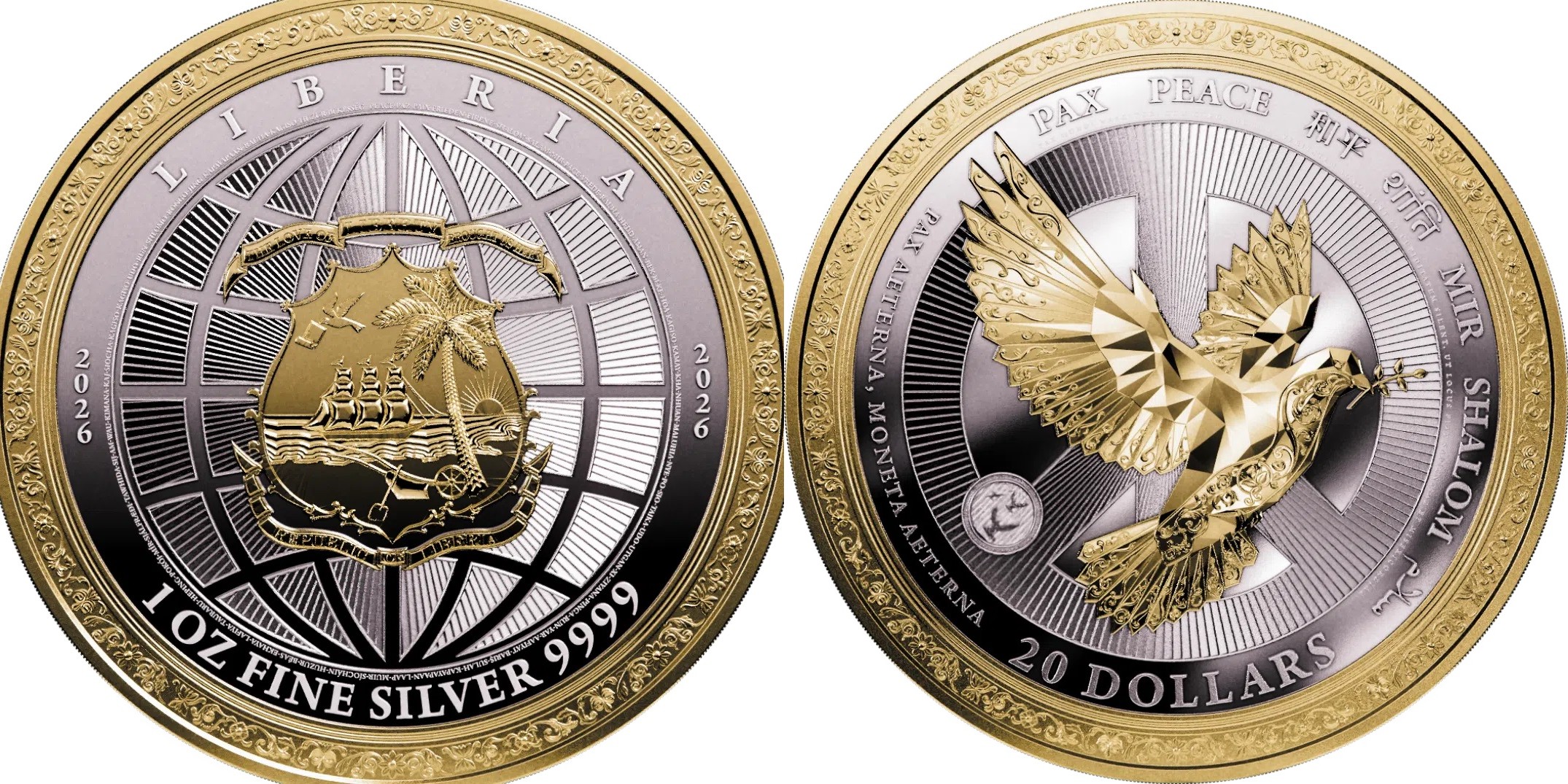 LIBERIA 20 Dollars 2026 – Peace – 1 oz 0.999 silver Proof-like (selective gilding) – mintage 500 pcs only – diameter 38.5 mm – unknown price.