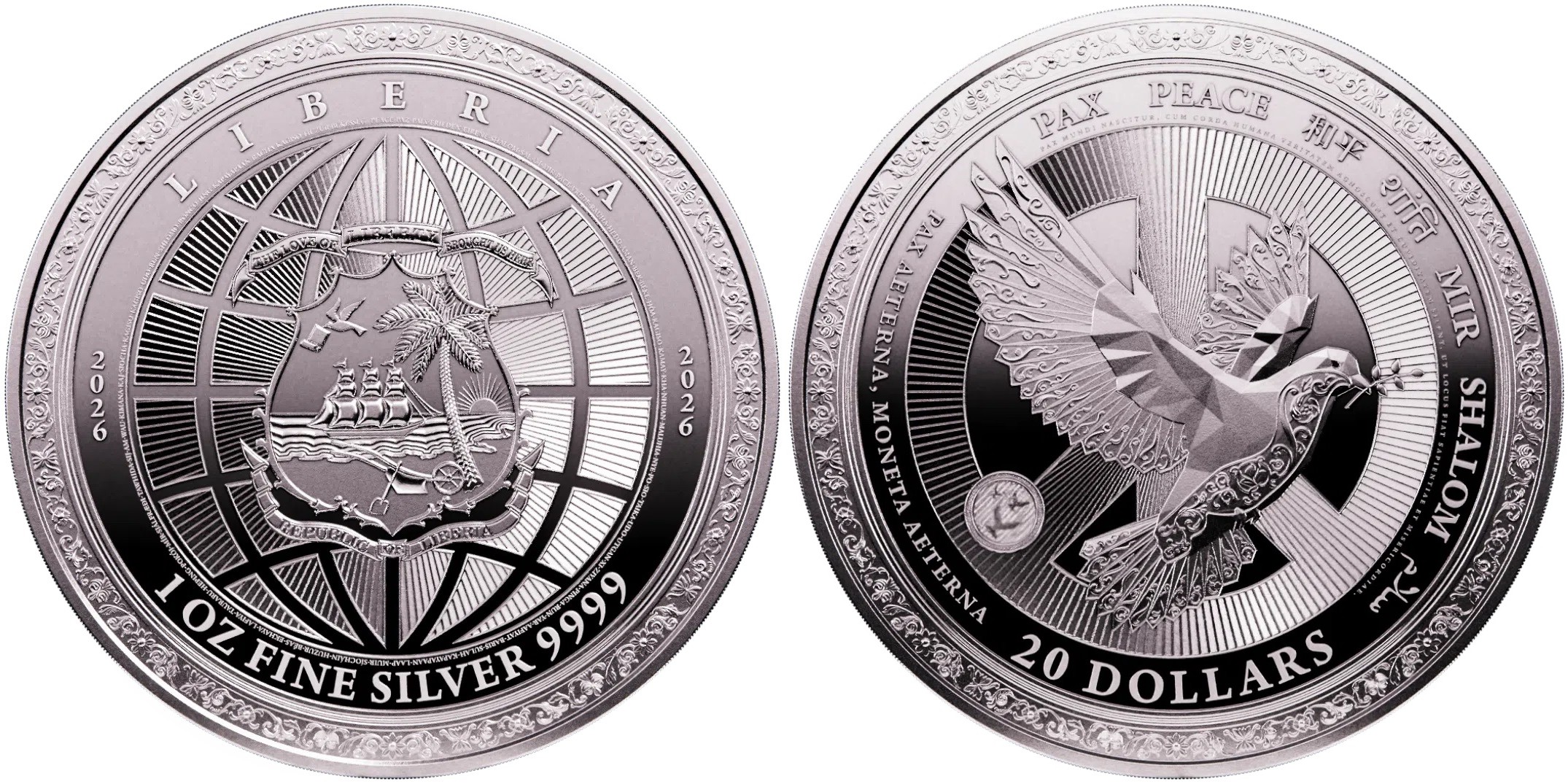 LIBERIA 20 Dollars 2026 – Paix – 31,1 g Argent 999 Proof-like – 5000 exemplaires – diamètre 38,5 mm – prix ignoré. Existe en finition bullion.