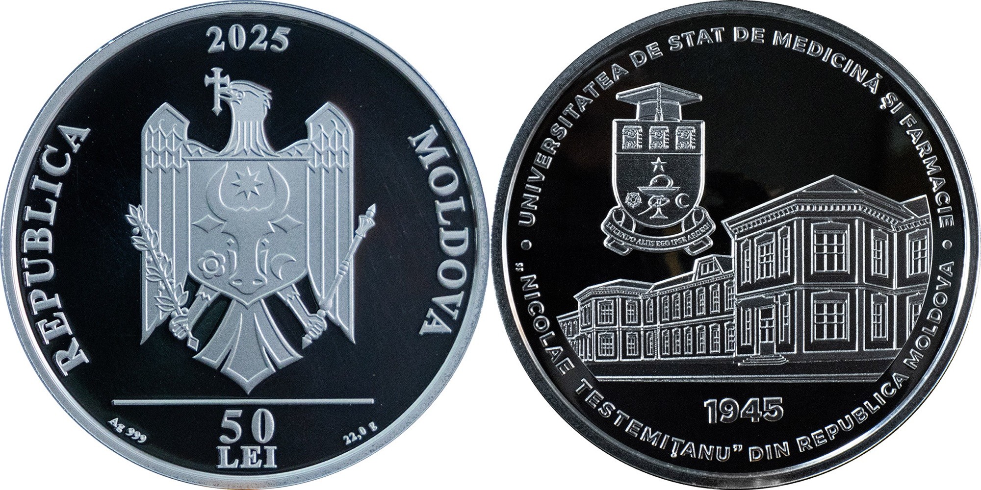 MOLDAVIE 50 Lei 2025 – 80 ans de l’université de médecine – 22 g Argent 999 Proof – 1000 exemplaires – diamètre 35 mm – prix ignoré.