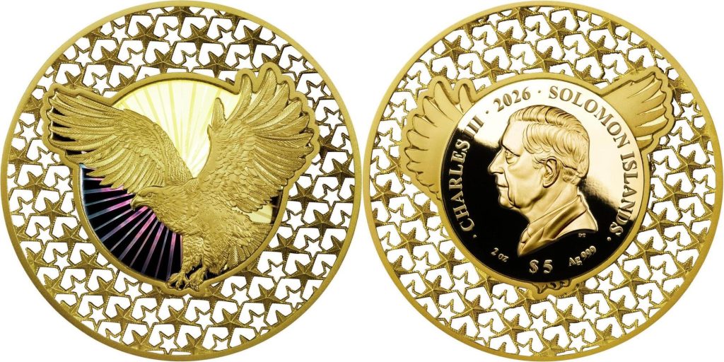 ILES SALOMON 5 Dollars 2026 – Filigrane aigle américain – 62,2 g Argent 999 Proof-like (plaqué or) – 1986 exemplaires – diamètre 60 mm – prix observé 349,95 euros.